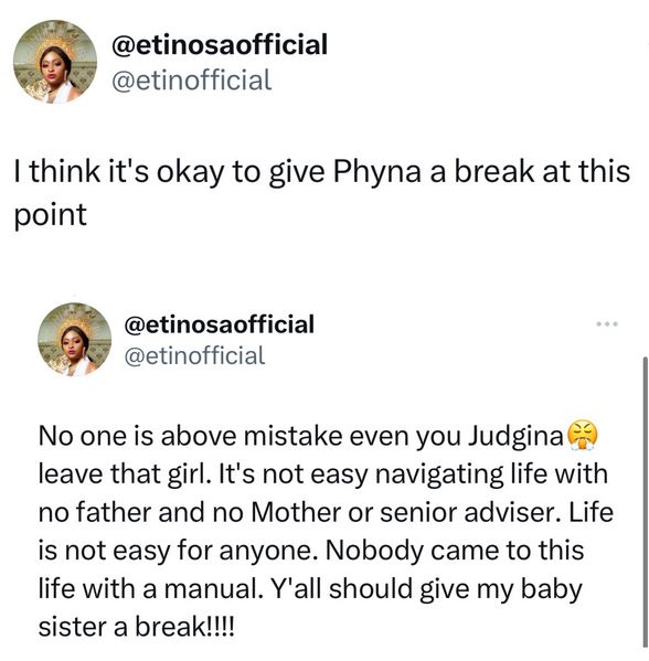 In a post shared on her X handle this afternoon April 22, Etinosa asked people to stop judging Phyna.