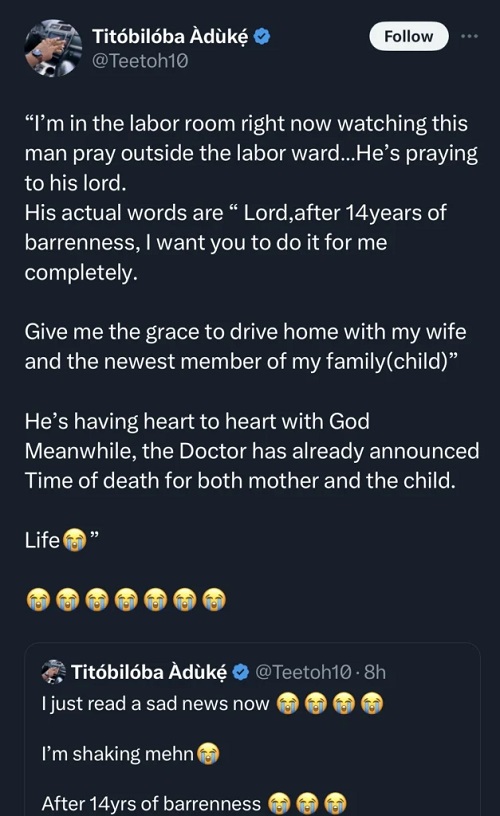 A Nigerian Twitter user has narrated the sad story of a man who lost his wife and newborn to the cold hands of death after 14 years of barrenness.