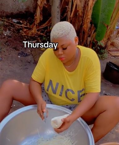 In a video that went viral on the TikTok app, the “slay queen” was shown switched into a hardworking girl after landing at her parent’s house in the village.