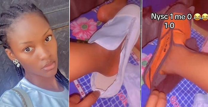 A serving corp member has taken to TikTok to share a video of the oversized shoes she was given by NYSC authorities.