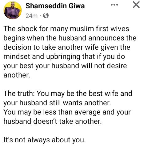 "The shock for many Muslim first wives begins when the husband announces the decision to take another wife given the mindset and upbringing that if you do your best your husband will not desire another," he wrote in a Facebook post on Thursday.