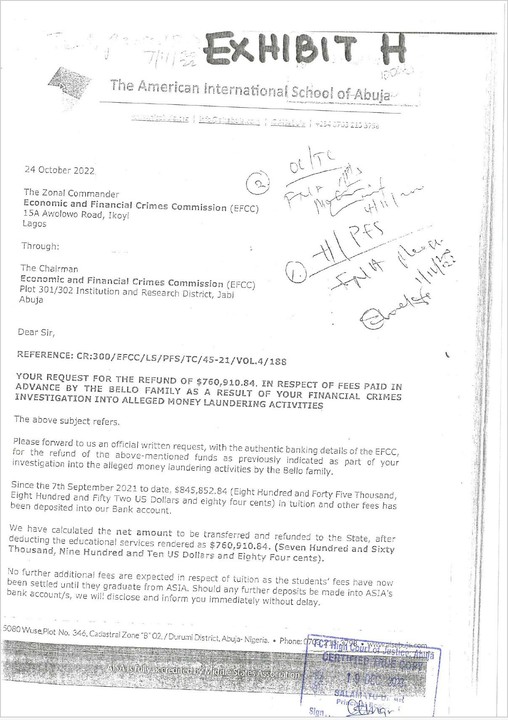 American International School Writes EFCC, to Refund $760,000 Paid for Yahaya Bello Children’s Fees (Screenshots)