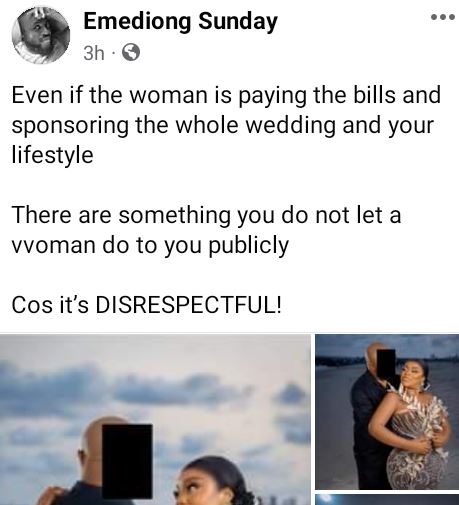 “Even if the woman is paying the bills and sponsoring the whole wedding and your lifestyle. There are some things you do not let a woman do to you publicly. Cos it’s DISRESPECTFUL,” he wrote in a Facebook post on Friday.