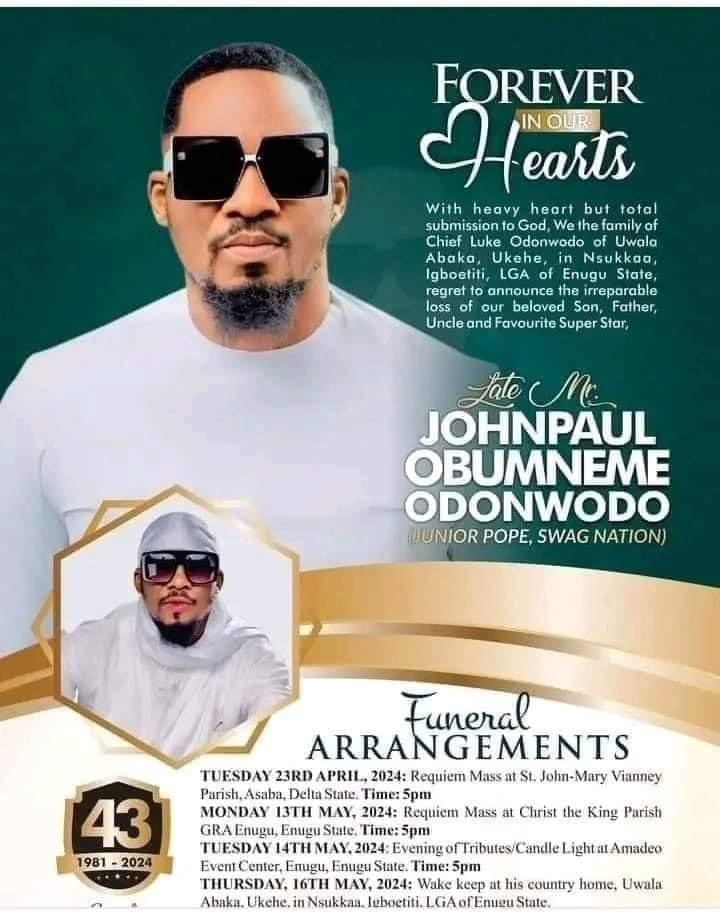 Pope will be buried on Friday, May 17, at his country home after a burial mass at Saint Peter’s Catholic Church, Ukehe. Interment will follow immediately after the burial of the actor.