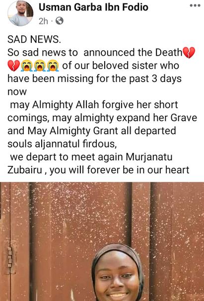 Murjanatu Zubairu, a 400-level student of the University of Abuja, who was reported missing by her family has been found dead.