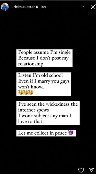 According to Uriel, the internet is full of toxicity hence, she will not subject her husband to any form of criticism or backlash from the public so she will never post about her husband when she gets married.