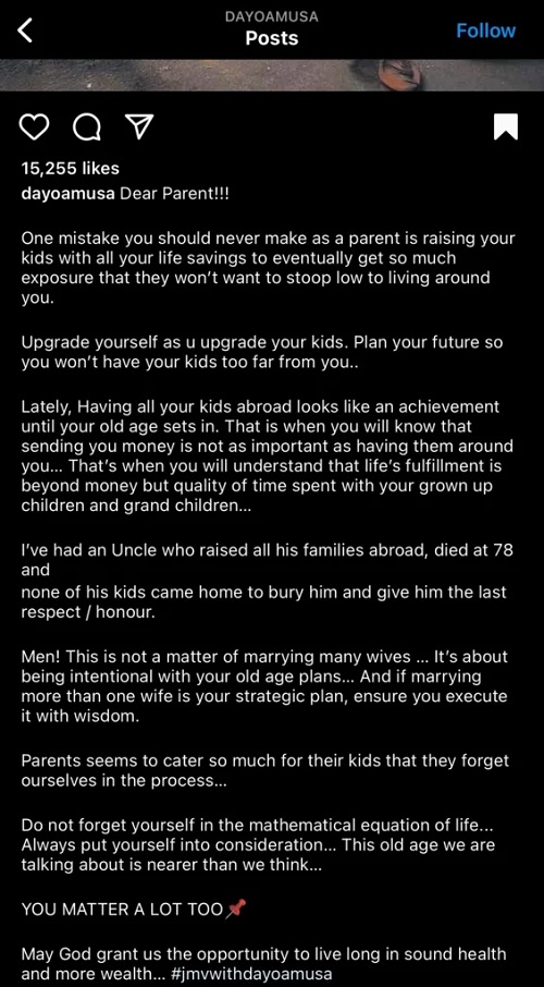 Men! This is not a matter of marrying many wives … It’s about being intentional with your old age plans… And if marrying more than one wife is your strategic plan, ensure you execute it with wisdom.
