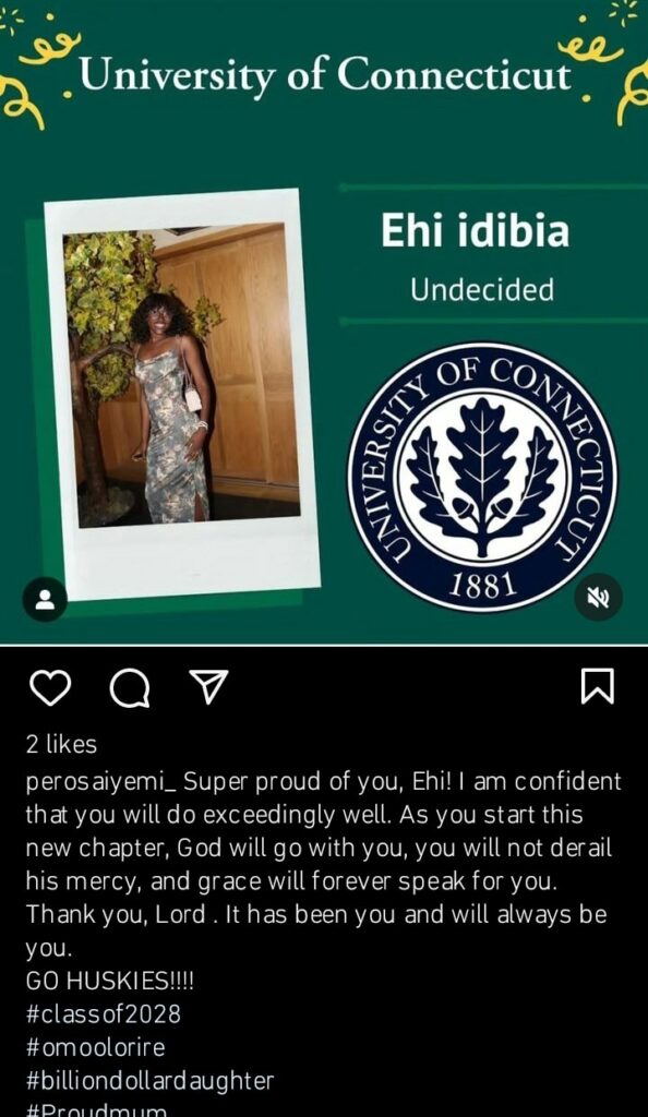 On her Instagram page, the proud mother announced that their daughter, Ehi Idibia got accepted into the University of Connecticut.