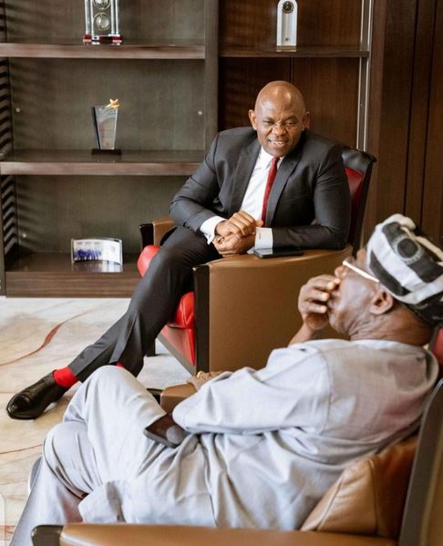 Ex-President, Chief Olusegun Obasanjo paid a visit to billionaire businessman, Tony Elumelu in his office. The reason for the visit to the CEO of the United Bank for Africa is unknown.