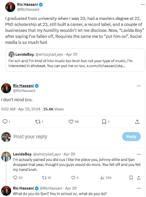 @RicHassani retorted: “I graduated from university when I was 20, had a masters degree at 22, PhD scholarship at 23, still built a career, a record label, and a couple of businesses that my humility wouldn’t let me disclose. Now, “Lavida Boy” after saying I’ve fallen off, Requires the same me to “put him on”. Social media is so much fun!”