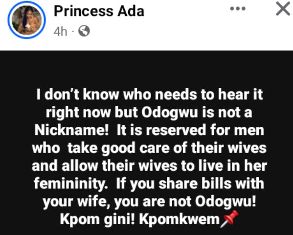 A Nigerian woman, Princess Ada, has taken to Facebook to state that the Igbo word ‘Odogwu’ is not a nickname.