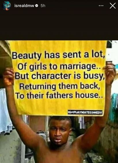 He wrote; “beauty has sent a lot of girls to marriage but bad character is returning them to their father’s house”
