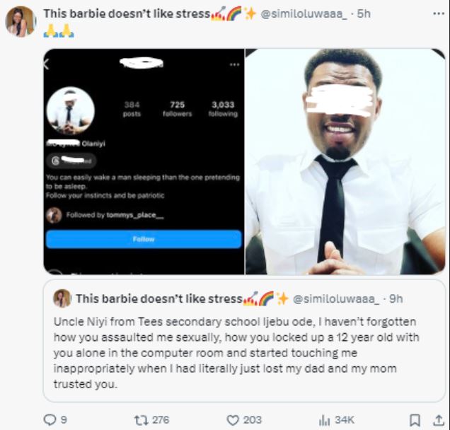 The woman identifies as Similoluwa wrote on X: “Uncle Niyi from Tees secondary school Ijebu ode, I haven’t forgotten how you assaulted me s*xually, how you locked up a 12 year old with you alone in the computer room and started touching me inappropriately when I had literally just lost my dad and my mom trusted you.”