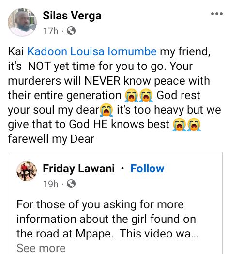 “U called me on Thursday last week that is been a while u just called to hear from me, I never knew it was a goodbye call. May ur killers never see peace. May ur soul & the souls of all the faithful departed through the mercy of God rest in peace," she wrote.