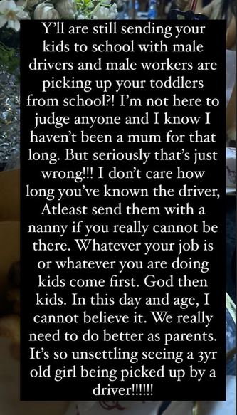 “Whatever your job is or whatever you are doing, kids come first. God then kids. In this day and age, I cannot believe it. We really need to do better as parents. It's so unsettling seeing a 3 year old girl being picked up by a driver,” she added.