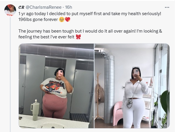 The lady known as Charisma Renee took to Twitter to reveal that she had made a decision one year ago to begin taking her health serious and went into work to lose weight.