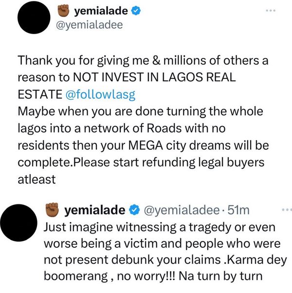 In a series of tweets posted online this morning May 5, Yemi said the state government is giving Nigerians reasons not to invest in Lagos real estate. In her post, she called on the state government to at least start refunding affected legal buyers the monies paid to the state government when purchasing their land.