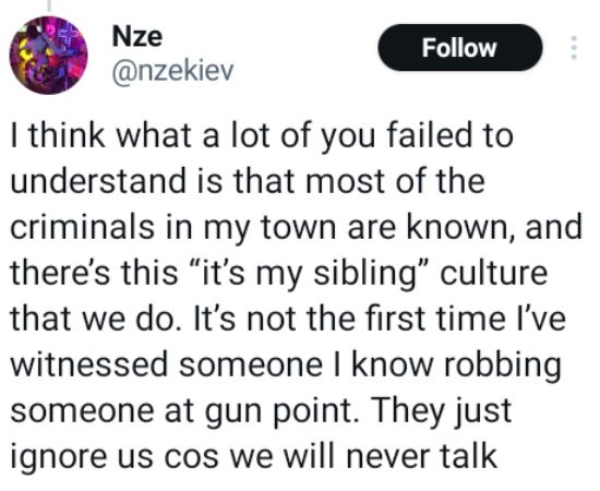 “I think what a lot of you failed to understand is that most of the criminals in my town are known, and there’s this “it’s my sibling” culture that we do. It’s not the first time I’ve witnessed someone I know robbing someone at gun point. They just ignore us cos we will never talk.”