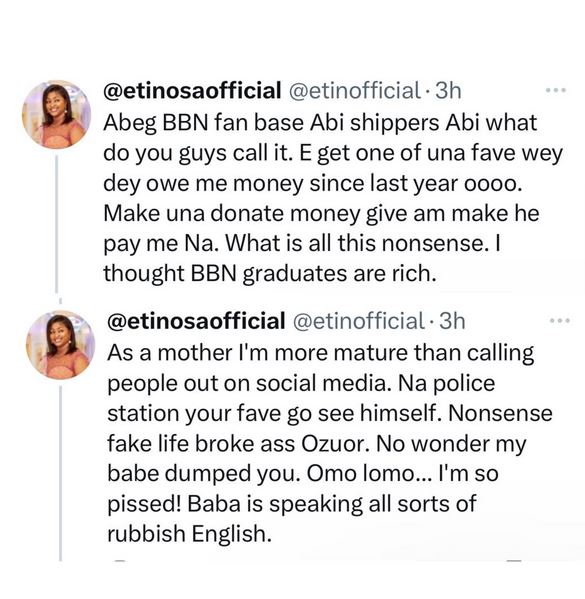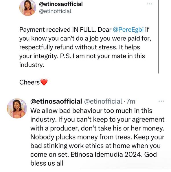 Popular Nollywood actress, Etinosa Idemudia, has called out former BBNaija housemate, Pere Egbi over his alleged refusal to refund money for an acting gig he did not do.
