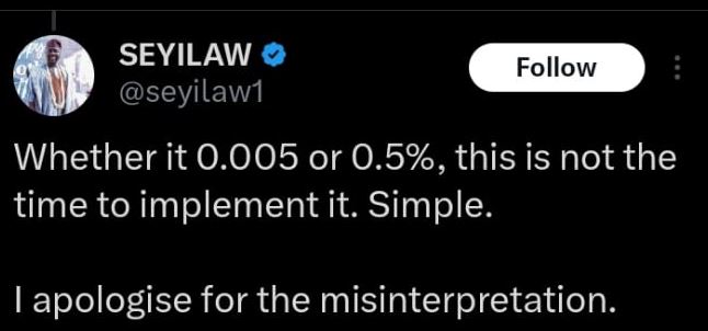 “Stamp duty is something, and now this. It is unacceptable. @NGRPresident @officialABAT, let the poor breathe. When will the new minimum wage be announced and implemented? Some of your ministers need to look for another job. One year is here and we are counting. Whether it 0.005 or 0.5%, this is not the time to implement it. Simple. I apologise for the misinterpretation.