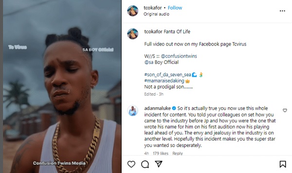 “So it’s actually true you now use this whole incident for content. You told your colleagues on set how you came to the industry before Jp and how you were the one that wrote his name for him on his first audition now his playing lead ahead of you. The envy and jealousy in the industry is on another level. Hopefully this incident makes you the super star you wanted so desperately.”