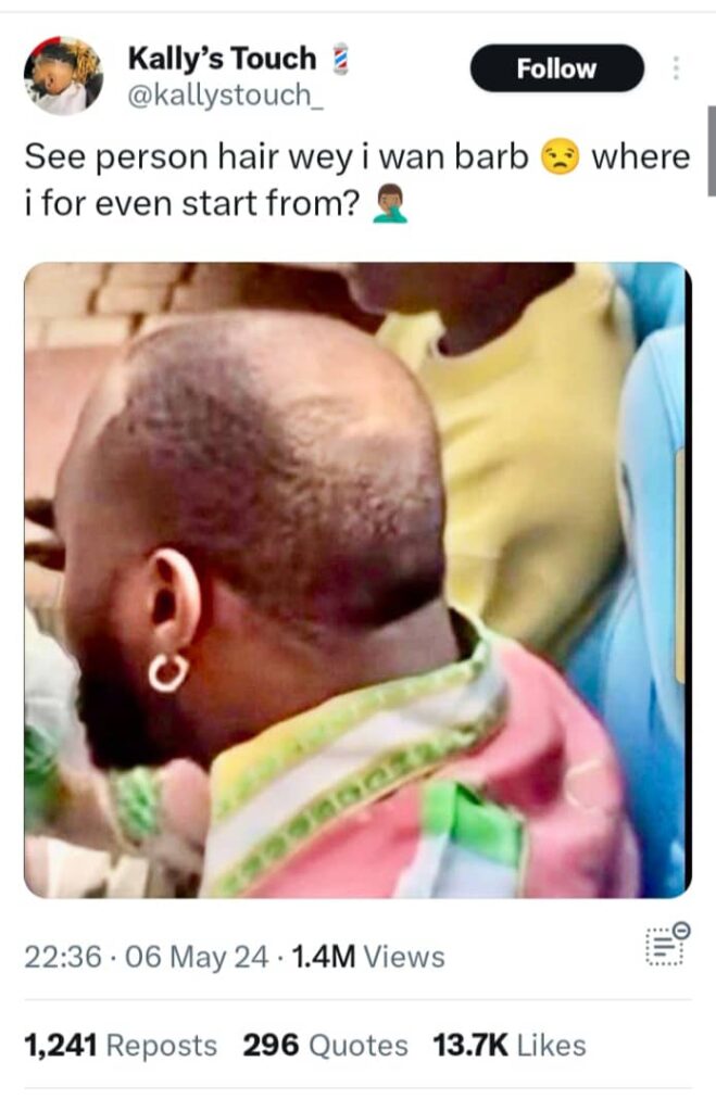 “See person hair wey i wan barb 😒 where i for even start from? 🤦🏽♂️,” he wrote.