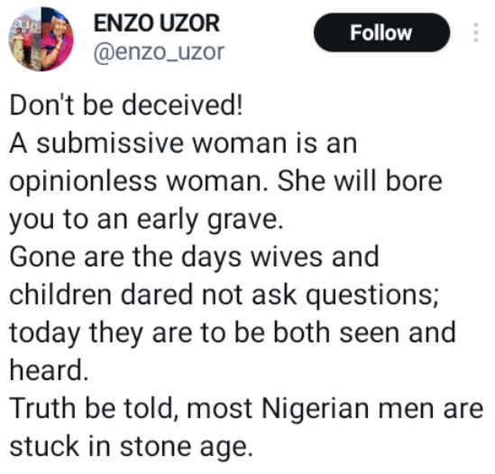 “Don't be deceived! A submissive woman is an opinionless woman. She will bore you to an early grave. Gone are the days wives and children dared not ask questions; today they are to be both seen and heard. Truth be told, most Nigerian men are stuck in stone age,” he wrote on Wednesday.