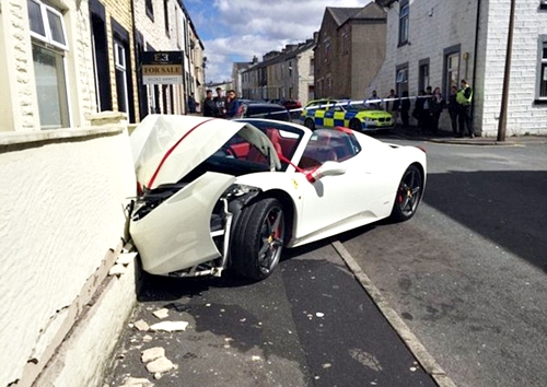 Photographs show the mangled remains of the white Ferrari 458 Spider moments after it drove into the wall in Burnely, Lancashire, yesterday afternoon.