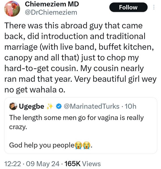 A medical doctor has taken to the 'X' platform to narrate the extent a man went to get his female cousin.