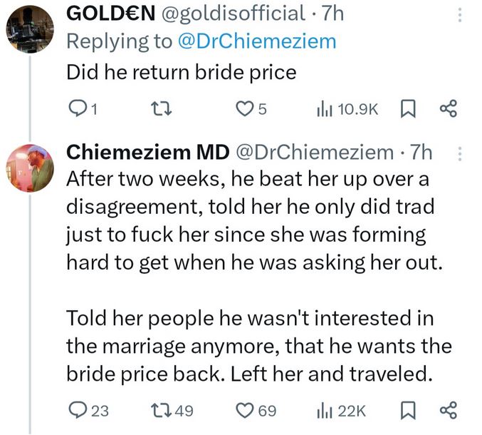 "Told her people he wasn't interested in the marriage anymore, that he wants the bride price back. Left her and travelled."