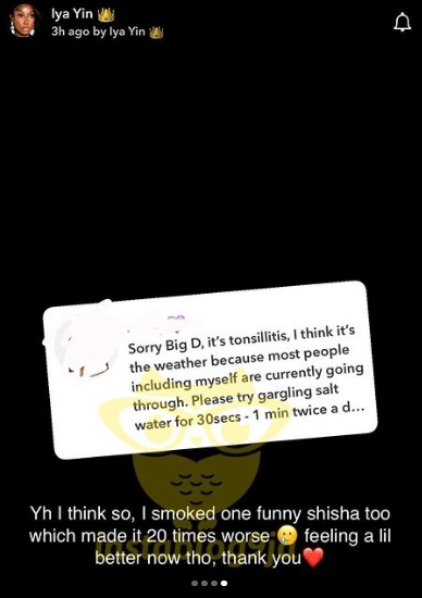 Ms DSF revealed that it was probably the funny shisha she smoked which made her problem 20 times worse.