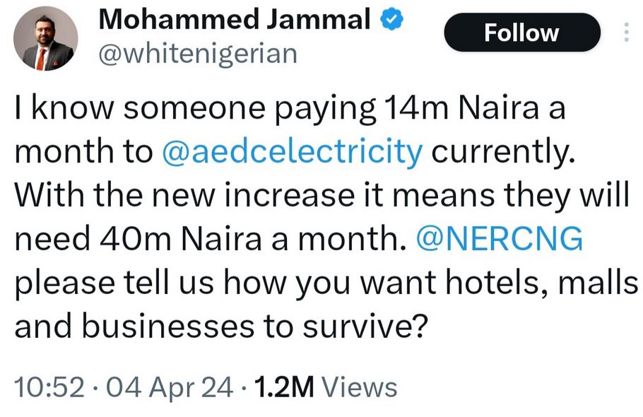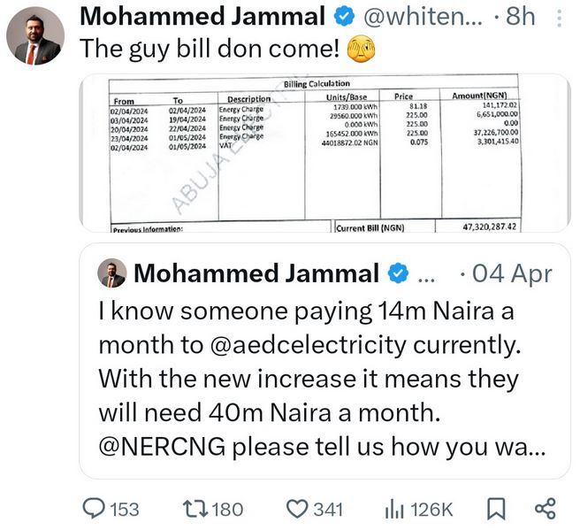 Earlier this month, Mohammed took to X to reveal that his friend pays N14m per month for electricity. He added that under the new electricity tariff, his friend would likely pay over N40m.