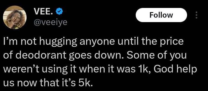 In her words: “I’m not hugging anyone until the price of deodorant goes down. Some of you weren’t using it when it was 1k, God help us now that it’s 5k.”