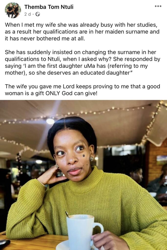 The South African man, identified as Themba Tom Ntuli took to his Facebook page to applaud his wife.