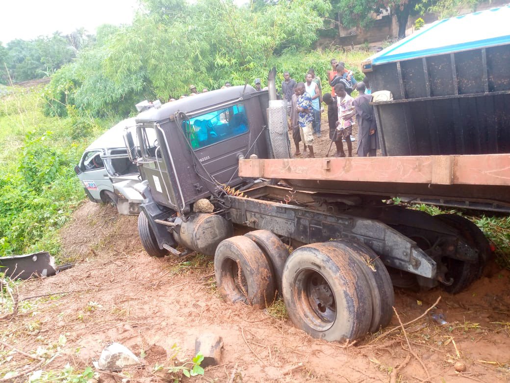 "Investigation into the incident revealed at about 19:45 hrs a Mac truck with registration number KGE 22, driven by Amaechi Chucks Nwankwo, a 35-year-old male from Obowo, Imo State, lost control while descending a slope at the aforementioned location and destroyed two military barricades which he wanted to use as wage to the truck. He eventually got to the third which is the police checkpoint at that location but collided with a stationary bus, resulting in the death of two passengers, injuring five others.