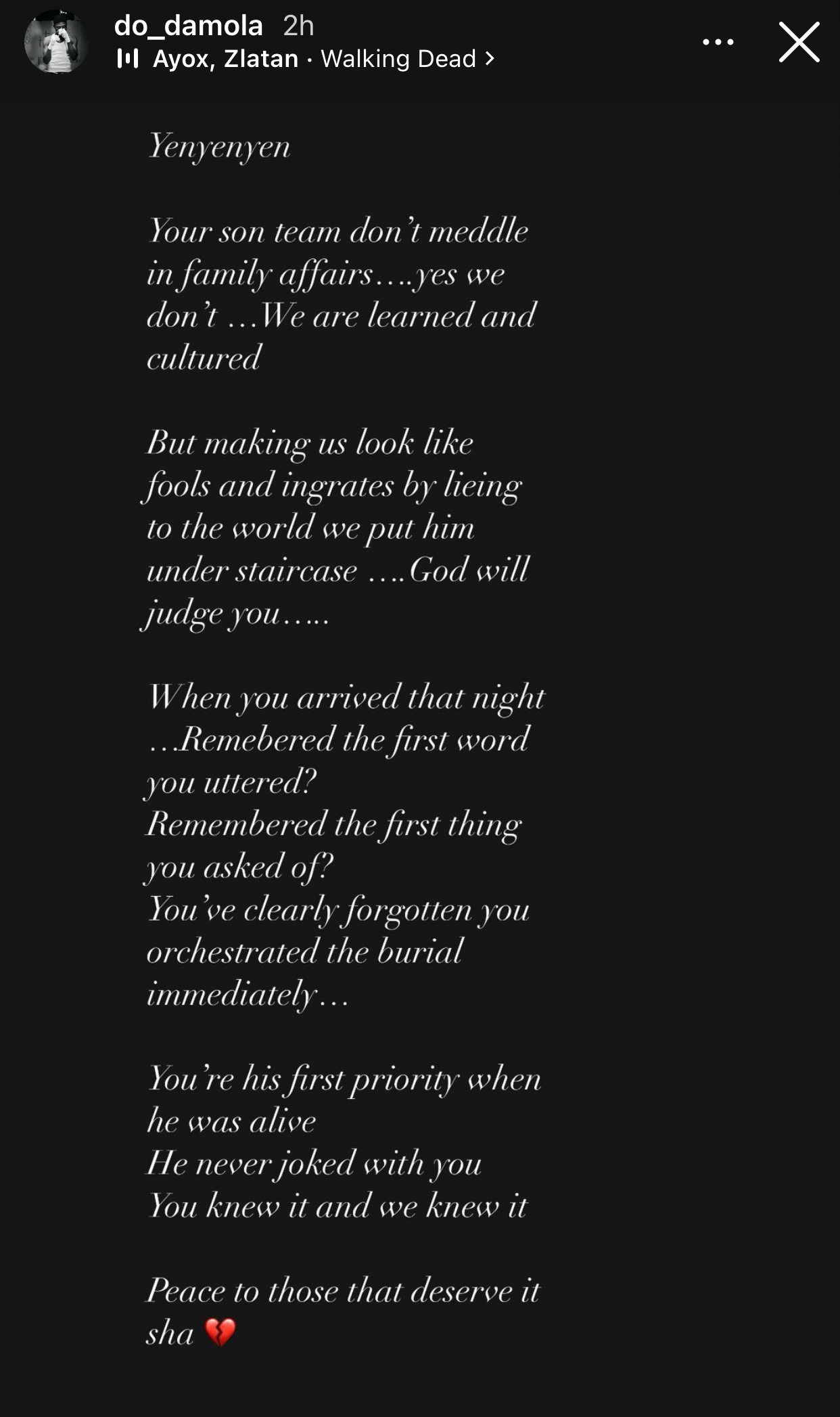 In a series of posts shared on his Instastories, Damola claimed the late Mohbad's father demanded the login details to Mohbad's YouTube page the night he passed away on September 12, 2023.