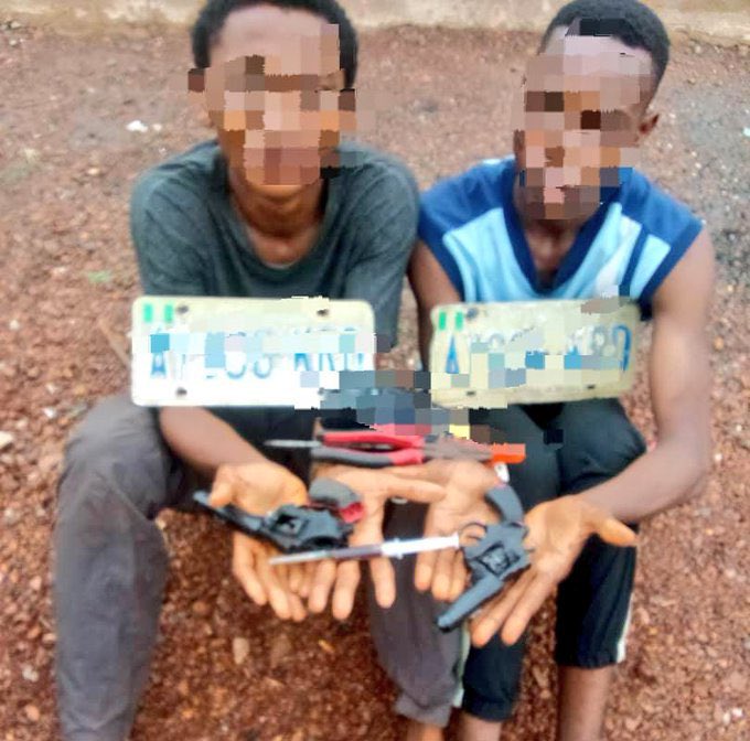 Enugu Police Command officers stationed at Oji-River Police Division, collaborating with Neighbourhood Watch Group members, apprehended Akabue Favour and Obayi Chiemezie for their involvement in armed robbery.