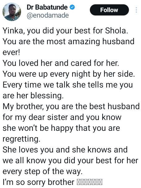 “Yinka, you did your best for Shola. You are the most amazing husband ever! You loved her and cared for her. You were up every night by her side. Every time we talk she tells me you are her blessing.