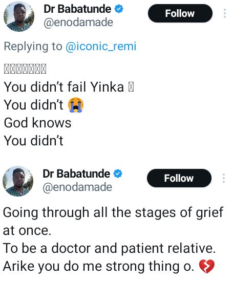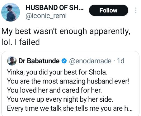 "My brother, you are the best husband for my dear sister and you know she won’t be happy that you are regretting. She loves you and she knows and we all know you did your best for her every step of the way. I’m so sorry brother,” his in-law, Dr. Babatunde wrote.
