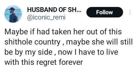 Yinka, a Nigerian man, has gone on social media to share his regret following the death of his wife, Shola.