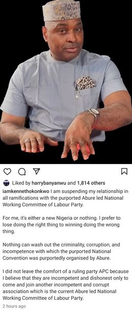 Okonkwo, who previously served as the spokesperson for the Labour Party Obi-Datti Presidential Campaign Council during the 2023 election, wrote on social media: "I am suspending my relationship in all ramifications with the purported Abure led National Working Committee of Labour Party.