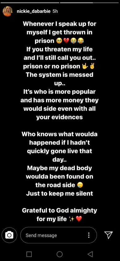 “Whenever I speak up for myself I get thrown in prison. If you threaten my life, I’ll still call you out, prison or no prison. The system is messed up. It’s who is more popular and has more money they would side with, even with all your evidence. Who knows what would have happened if I hadn’t quickly gone live that day. Maybe my dead body would have been found on the roadside just to keep me silent. Grateful to God almighty for my life. Each time I trust a man, they show me shege banza.”