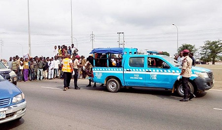 FRSC officers take the man’s corpse into their patrol van yesterday (Photo: Abubakar Sadiq Isah)