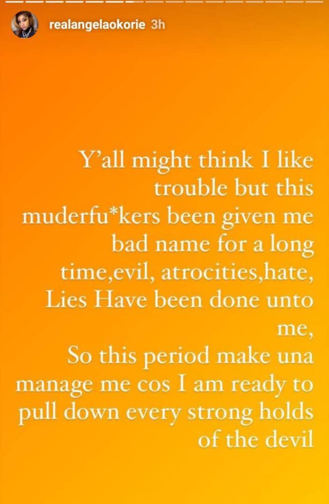 “Y’all might think I like trouble but this muderfu*kers been given me bad name for a long time,evil, atrocities,hate, Lies Have been done unto me. So this period make una manage me cos I am ready to pull down every strong holds of the devil