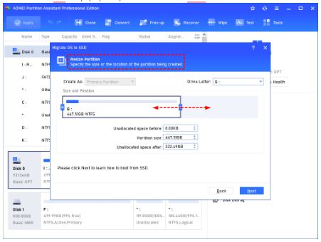 Step 3. You are able to resize the system partition on this page. Then a note on how to boot Windows 10 on SSD will pop up. Keep it in mind and click “Next”.