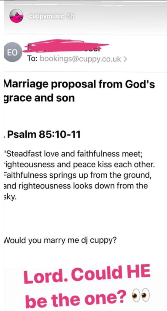 The heading of the email read: “Marriage proposal from God’s grace and son” alongside a marriage proposal, “Will you marry me dj cuppy.”