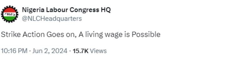 The Nigeria Labour Congress has insisted that it would embark on the nationwide strike scheduled for Monday, June 3.