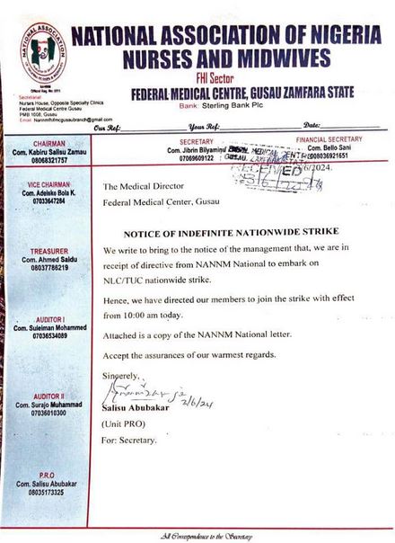 A statement by the unit PRO of NANNM at the Federal Medical Centre, Gusau, Zamfara State, Salisu Abubakar, confirmed the directive from the national body of the union to join the ongoing strike.