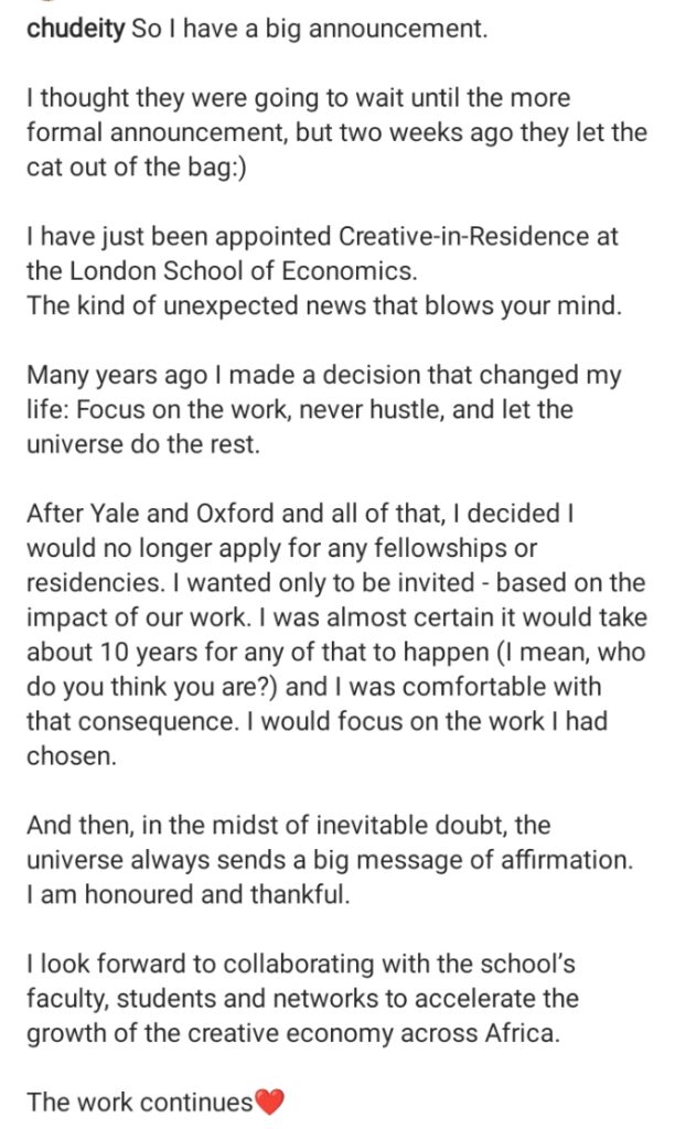 Chude took to social media to excitedly announce his latest appointment as Creative-in-Residence at the London School of Economics.