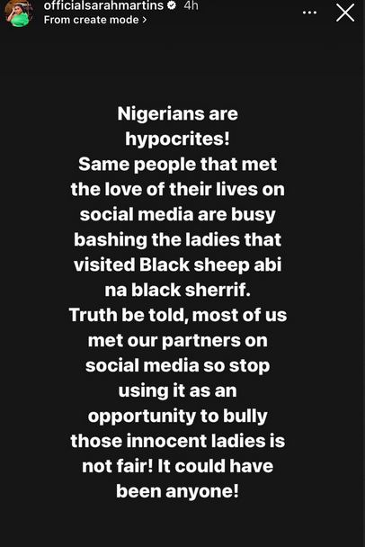 Popular Nigerian actress, Sarah Martins, has taken a swipe at those she referred to as ''hypocrites'' for blaming two ladies, Afiba and Celine, who went missing after leaving Port Harcourt Rivers State to Aba, Abia state, to visit a man they met online.